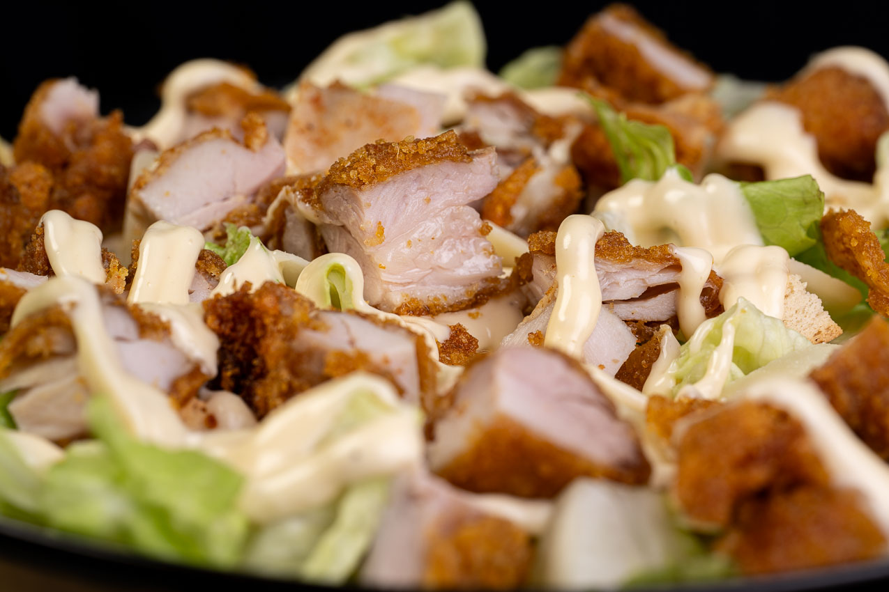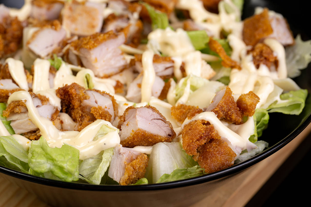 Fresquisimas hojas de lechuga romana de unos huertos locales, con nuestro pollo especial crispy, lascas de queso parmesano italiano, picatostes y obviamente aderezada con nuestra exquisita Salsa César.